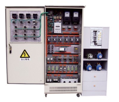 該裝置按標準電氣控制柜設計制造規(guī)格,充分利用雙面位置,柜內(nèi)裝有完成各種照明電路所需的單相電度表、日光燈、單聯(lián)開關(guān)、插座、感應開關(guān)、漏電開關(guān)等,以及電氣控制所需要的多種低壓電器,如漏電斷路器、熔斷器、電流互感器、交流接觸器、時間繼電器、熱繼電器、中間繼電器、行程開關(guān)、按鈕、信號燈、轉(zhuǎn)換開關(guān)、電壓表、電流表、功率表及電度表等,為了延長電器使用壽命,各電器的接點都與接線端子相連,再由接線端子與被控制電氣連接。
