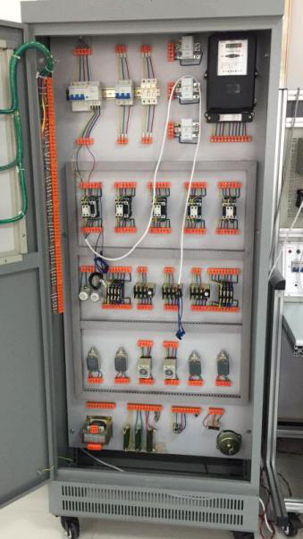 該裝置按標準電氣控制柜設計制造規格,充分利用雙面位置,柜內裝有完成各種照明電路所需的單相電度表、日光燈、單聯開關、插座、感應開關、漏電開關等,以及電氣控制所需要的多種低壓電器,如漏電斷路器、熔斷器、電流互感器、交流接觸器、時間繼電器、熱繼電器、中間繼電器、行程開關、按鈕、信號燈、轉換開關、電壓表、電流表、功率表及電度表等,為了延長電器使用壽命,各電器的接點都與接線端子相連,再由接線端子與被控制電氣連接。
