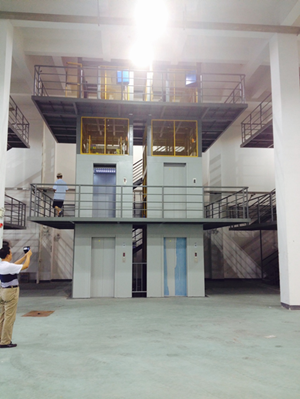 整個裝置采用真實的部件組成,導軌、轎廂、廳門、轎廂門、限速器、對重裝置等都采用真實的部件或配套的機構。控制部分采用全數(shù)字化的微機控制系統(tǒng)(VVVF),曳引機采用目前最主流的永磁同步電動機驅(qū)動,同時配套有相應的故障點設置,學生可以通過故障現(xiàn)象在裝置上檢測查找故障點的位置,并將其修復。學生也可以根據(jù)電梯定期檢查的要求對電梯的相應部位進行檢測和修護。通過在該實訓裝置上的實訓,使學生能夠真正學習和掌握電梯的維保技術及技能。特別設計的井架,為老師在實訓中對學生的教學和指導提供了非常方便的平臺。