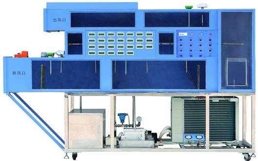由一個(gè)模擬房間,和一個(gè)組合式風(fēng)柜組成。模擬房間采用30*30工業(yè)標(biāo)準(zhǔn)鋁型材和雙面烤漆木板結(jié)構(gòu),內(nèi)部裝有和真實(shí)空調(diào)末端同樣的風(fēng)機(jī)盤管,三級調(diào)速,由調(diào)整開關(guān)用戶自由調(diào)。組合式風(fēng)柜系統(tǒng)由回風(fēng)口,新空氣混合風(fēng)口,送風(fēng)機(jī),中央空調(diào)蒸發(fā)器,管道,電磁閥組成。