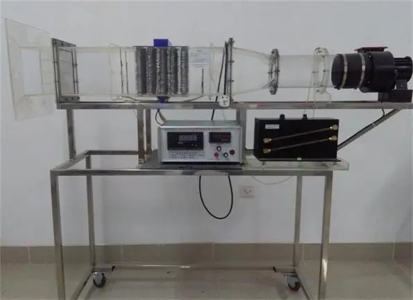 多翼式低噪音風(fēng)機,自動調(diào)節(jié)風(fēng)門,組合式有機玻璃風(fēng)洞,翅片加熱管,加熱由固體調(diào)壓模塊配電位器調(diào)節(jié)加熱功率,數(shù)顯電流表、電壓表,翅片管簇順排和叉排組合,溫度傳感器,畢托管配差壓傳感器測量風(fēng)量,16路萬能信號輸入巡檢儀顯示溫度、阻力、流量,不銹鋼支架。