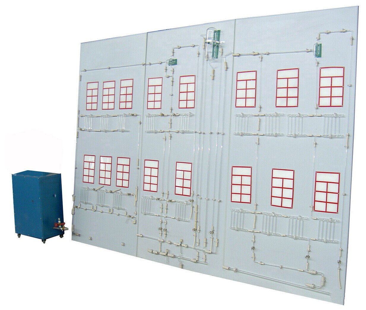 模擬采暖散熱器片、采暖供水干支管道、回水干支管道、集氣罐、高位膨脹水箱、溢水管、信號管、循環管、排水管、膨脹管、模擬房間墻面、模擬供暖鍋爐、供水泵、供水箱、實驗臺框架等。