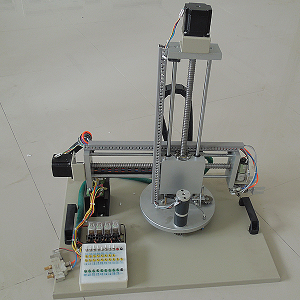 電氣方面由步進電機、步進電機驅動模塊、傳感器、光電編碼器, 電磁閥、帶有位控功能的 PLC 主機等部件組成,能完成料 塊的碼放、移動等功能, 可由學生自行完成該裝置各部件的組裝、接線、軟件編程、調整等訓練,可實現機械手五維控制, 完成料塊的碼放、移動等。