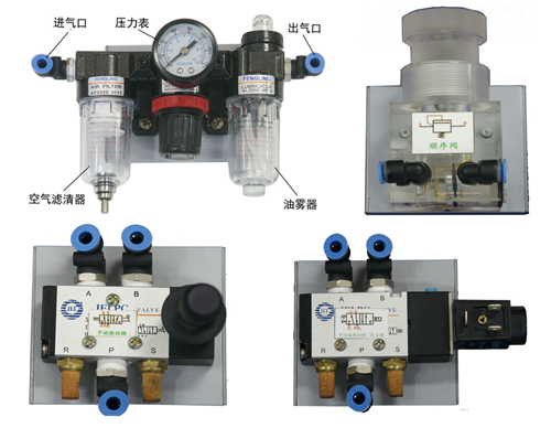 空氣過濾、減壓、油霧器三聯件,減壓閥,手動換向閥,電磁換向閥,氣控換向閥,行程閥,單向閥,節流閥、單向節流閥、快速排氣閥,或門 型梭閥,單作用氣缸,雙作用氣缸、旋轉氣缸,行程開關(常閉、常開)等。