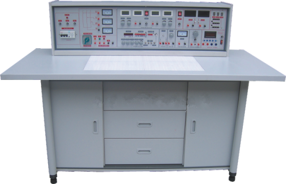 (一)實驗桌:學生實驗桌12張,一桌二座,實驗桌外形尺寸為160×70×80cm。桌子中央配置九孔電路插板,電路板注塑而成,表面布有九孔成一組相互聯通的插孔,元件盒在其上任意拼插成實驗電路。元件盒盒體透明直觀,內裝電阻、電容、電感、二極管、三極管、場效應管、可控硅等元件來完成原理實驗。內裝元件一目了然,盒蓋印有永不褪色元件符號,線條清晰美觀。盒體與盒蓋采用較科學的壓卡式結構,維修、拆裝方便。繼電部分訓練元器件已裝在特制的元件盒上,實訓時插在九孔電路板上即可連線實驗,方便,靈活。模電、數電實訓項目由二十幾套實訓電路板和相應元器件來完成。每張操作桌配有一粒膠皮板,保護通用電路板和桌面(如出需要在桌上放置電動機、焊接等) 桌子下部是元器件儲存柜,放置實驗元件、器材、工具等。