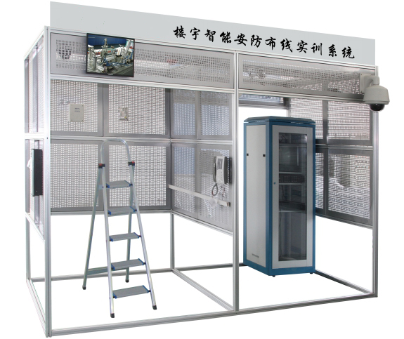 設(shè)備由1臺鋁合金支架和17塊網(wǎng)孔板搭建而成的兩層模擬樓宇建筑,分別模擬一棟樓宇建筑的一層機房、一層樓道、一層樓道大門、二層樓道、二層樓道窗戶、二層住戶、二層住戶大門、二層住戶窗戶、垂直豎井和建筑周邊。房間提供正反面?zhèn)葔晚攭Φ陌惭b范圍,可在上面安裝各種樓宇智能化器件;同時還提供房間大門和窗戶,可在上面安裝電插鎖、電磁鎖、門磁和窗戶防盜探測器等器件,實現(xiàn)智能建筑各類系統(tǒng)的安裝與運行,如“對講門禁及室內(nèi)安防系統(tǒng)”和“閉路電視監(jiān)控及周邊安防系統(tǒng)”等。相比于單層模擬樓層,兩層模擬樓層需要考慮智能建筑的多樓層結(jié)構(gòu)關(guān)系,除了能夠培養(yǎng)學生的工程施工能力外,更能夠培養(yǎng)其工程設(shè)計能力與工程創(chuàng)新能力,符合高等院校的實踐教學需求。