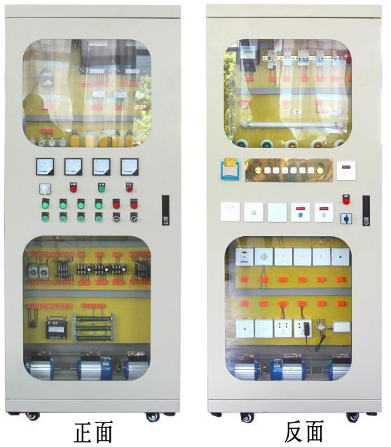 1、本裝置采用正反二面開門的離墻式威圖電氣控制柜,且正反面同時都可以操作,柜體中寬度能保證兩個學生同時合作接線實訓的需要,其外形尺寸寬×厚×高分別為:800×600×2000 mm。柜體采用厚度為國標1.5以上的優質鋼板,柜門采用厚度為國標2.0以上的優質鋼板并安裝四塊大的玻璃,學生能通過玻璃看清柜內各元器件及相應的動作,金屬表面噴塑,柜體中間有二塊優質環氧樹脂絕緣板和相應的支架系統隔離正反兩個柜體,安裝板上安裝智能建筑電氣控制線路各實訓考核模塊。各元器件所有的接線端都連接至相應的專用實訓接線端子上,每個接線端上都套有用電腦打印接線端名稱及編號的套管,并且更換方便。被控制電機安裝于電氣控制柜內。