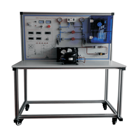 本裝置敞開式設計,安裝有制冷管路設備,配各種電路原理圖實訓板,并將電路所需的電器元件安裝在實訓板上,學生可根據電路原理圖的要求進行制冷電路的接線實訓、制冷回路相關指示數據的分析、制冷回路常見故障分析等。提供商用電冰箱電氣控制線路的實際工業用電器,形象直觀,可靠性好,使用壽命長, 可自行連接線路,并任意設置故障點。適用于技工院校、職業學校作為制冷基本技能的實訓。
